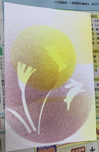 網に絵の具を付けた歯ブラシをこすりつけ、絵の具をカードにとばすと……