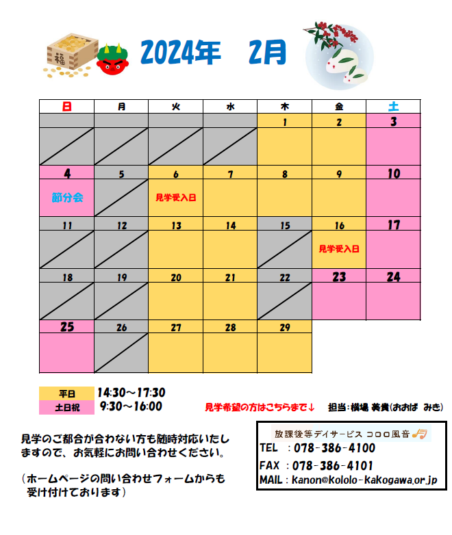 受け入れカレンダー【2月】