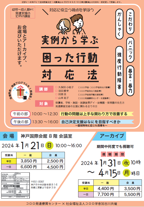 お知らせ1月21日(日)講演会【実例から学ぶ困った行動対応法】㏌神戸国際会館公開日:2024.01.17・更新日:2024.01.17開催間近となりました!! お子さんと関わる時に【どうしたらよいのだろう?】という疑問を持たれたことはありませんか?そんな疑問に、長年自閉症療育に携わってきた専門家達がお答えします。会場では質疑応答の時間もありますので是非とも皆様、会場にお越しください♬ ⇓会場お申込みはコチラから⇓ ⇓詳しくはコチラから⇓※アーカイブのお申込みもこちらからお願い致します。
